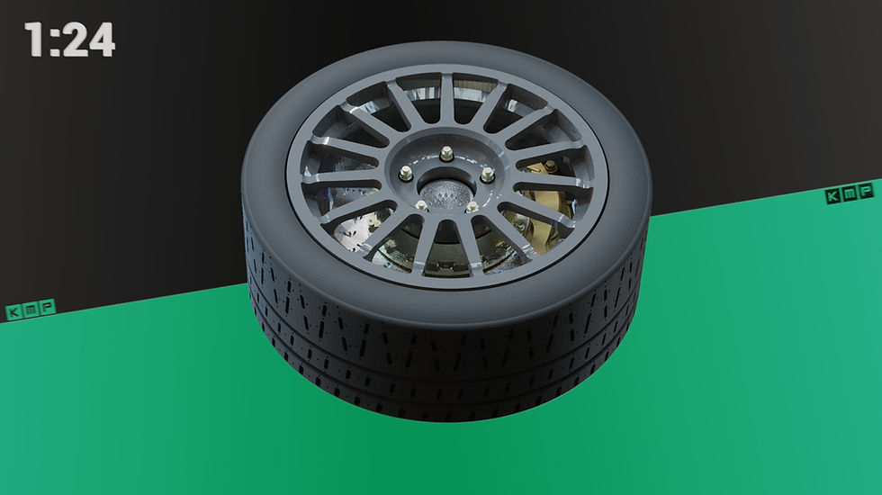 5 rims and tires, with split rim capsFull brake discs, hubs and calipers, all separate for higher detailing